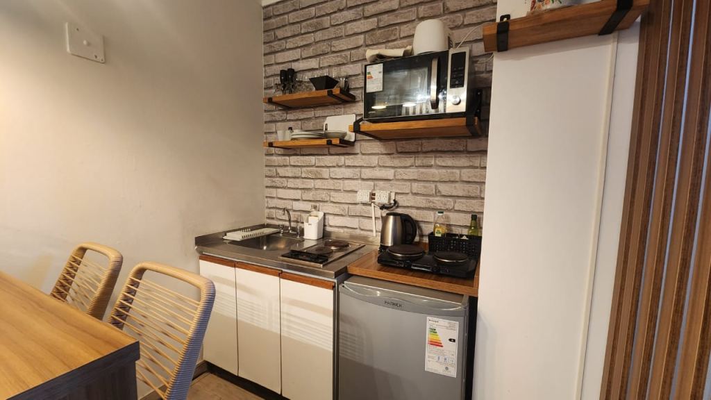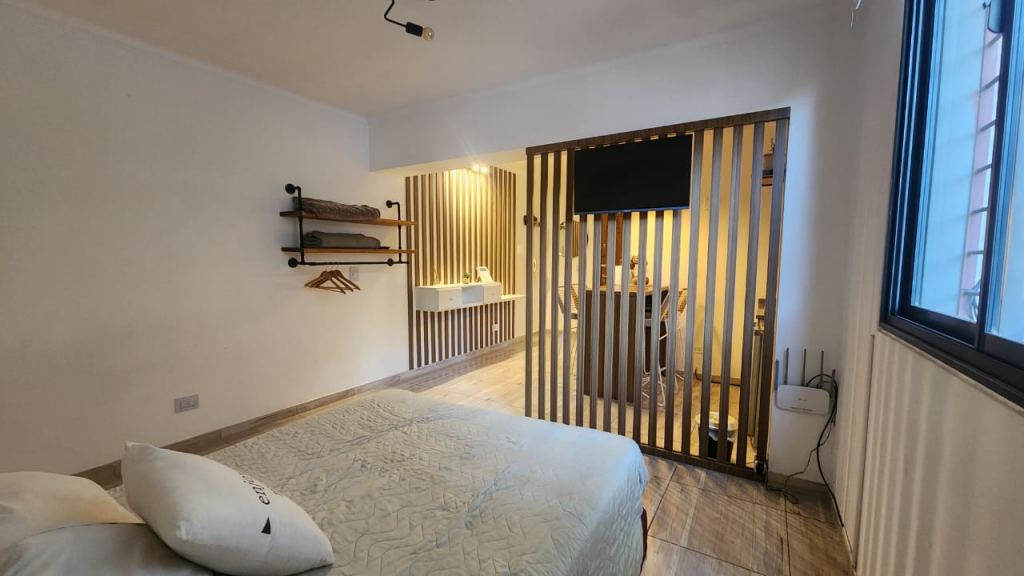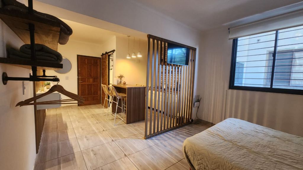 Posee dormitorio, cocina con barra desayunador y un baño completo